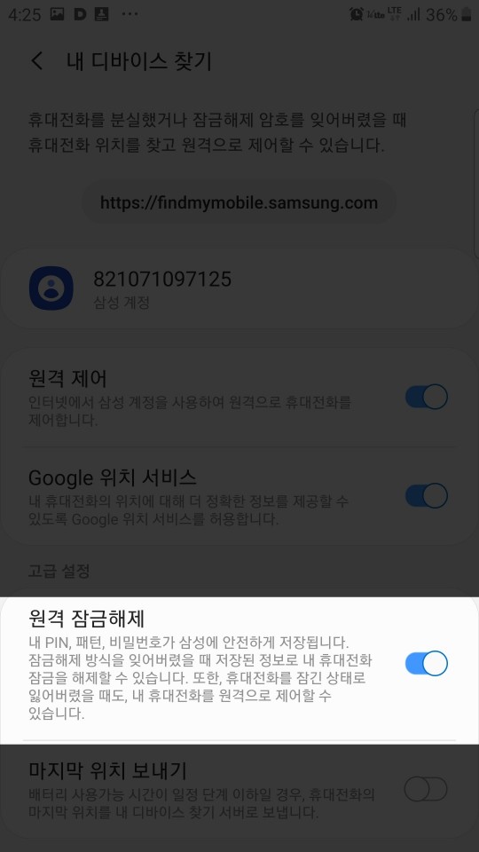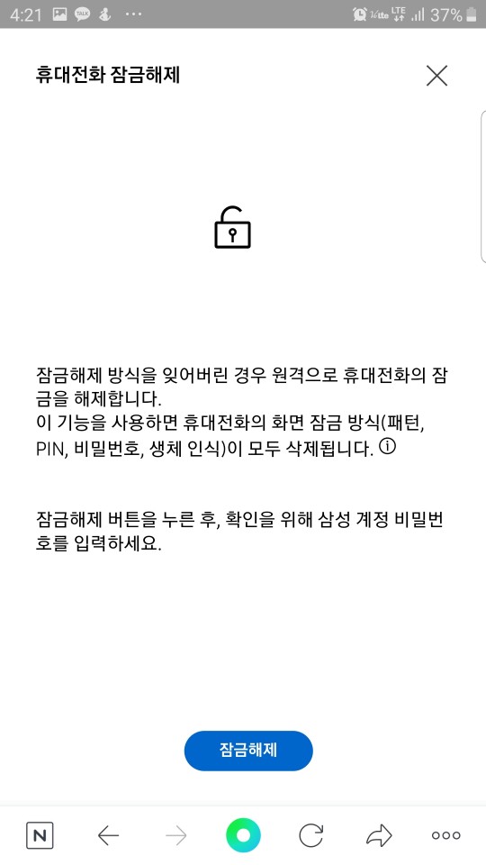 하지만 이 기능을 사용하시려면 우선 설정에서 원격잠금해제 기능을 ON 해두셔야 되기 때문에 지금이라도 안되어 있으시다면 꼭 설정을 바꿔두시길 바래요. 나중에 원격으로 잠금을 해제하려 하는데 해제가 되지 않아 내 휴대폰 내에 있는 자료가 모두 날아가 버리면 멘붕이 옵니다.