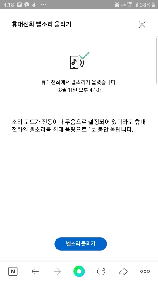 제가 가장 좋아하는 기능이에요. 벨소리 울리기 기능은 건망증이 심하신 분들에게는 필수적인 기능이라 생각합니다ㅎㅎ 저의 경우는 폰을 어디다 두었는지 기억이 안날 때, 자고 일어났는데 폰이 사라졌을 때(저만 그런가요?) 찾다가 5분정도 지나면 스트레스가 몰려오기 시작합니다. 그럴 때 이기능 하나면 최대음량으로 1분간 우렁차게 울려주니 시간 소비할 거 없이 바로 찾을 수 있어서 저에겐 워너비 기능이 틀림 없습니다.