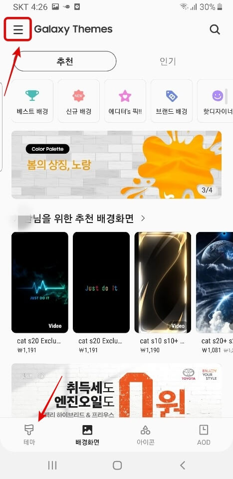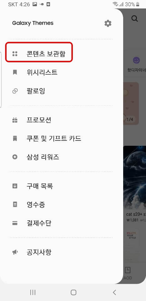 왼쪽 상단에 메뉴 버튼을 눌러주세요. 그리고 콘텐츠 보관함으로 들어갑니다. 그러면 내가 설정한 테마와 내가 구매하거나 다운로드한 테마들을 볼 수 있습니다.