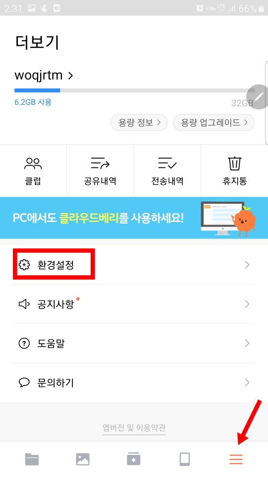 위 왼쪽 사진 아래에 햄버거 로고를 클릭하시고 환경설정을 클릭해주세요. 그런 다음 자동 업로드를 ON으로 해주시면 내 핸드폰이 와이파이에 연결이 되면 자동으로 내 자료들이 저장되게 됩니다.