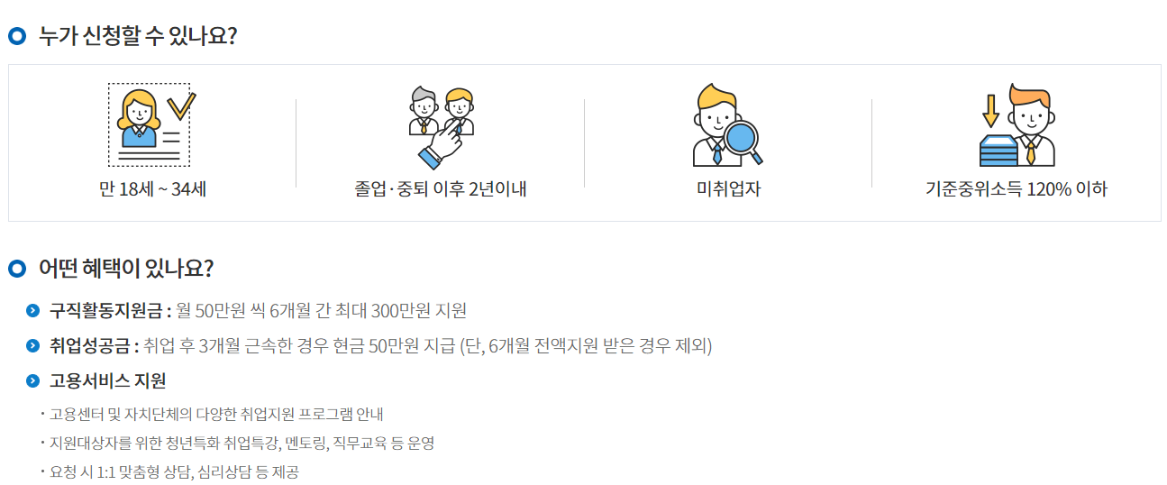 -우선 청년 구직활동 지원금은 만18세~34세까지 고등학교를 졸업하거나 대학교를 졸업한 2년 이내의 미취업자인 경우에 신청을 할 수 있습니다. (중퇴자도 포함)