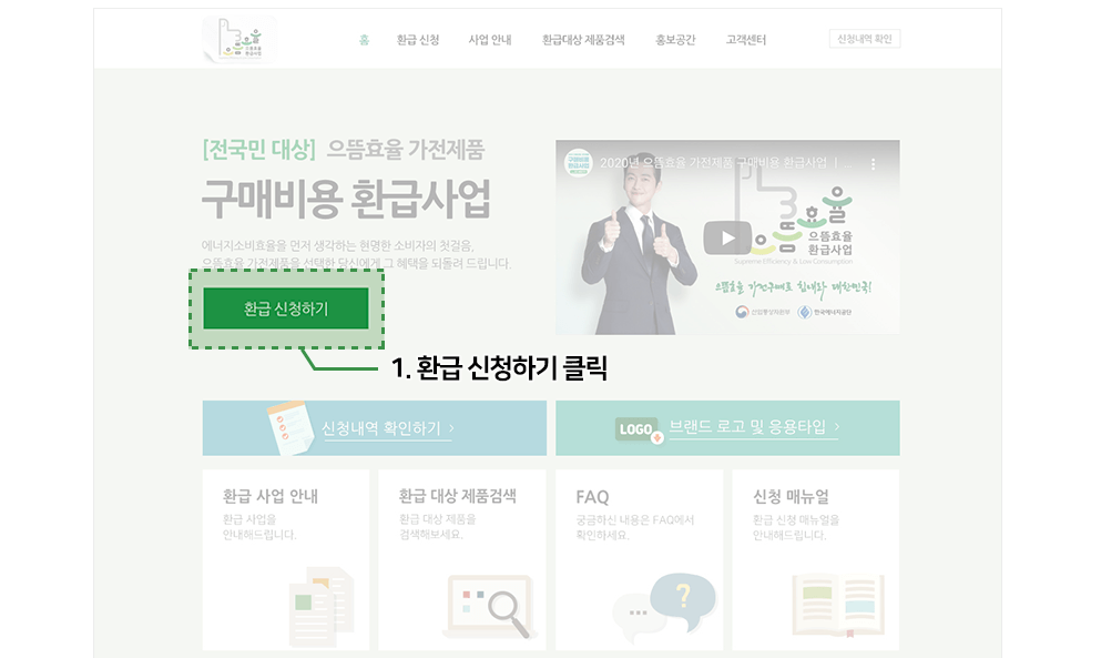 이제 으뜸효율 가전제품 구매비용 환급 사업 홈페이지에 들어가서 신청을 해줘야 합니다. 컴퓨터와 핸드폰 둘 다 신청이 가능해요.