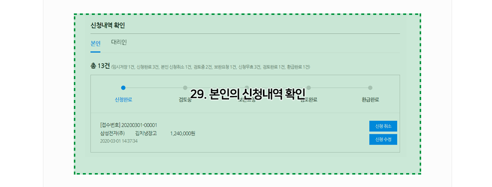 본인 인증 절차만 완료가 되면 맨 처음에 필요했던 효율등급 라벨과 명판 구매 영수증 등만 준비되어있으면 신청절차는 빠르게 완료가 됩니다.