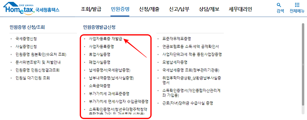 사업자 등록증 재발급 신청을 위해서는 홈텍스 홈페이지에 들어가 줘야합니다. 예전에 몇 번 발급한 기억이 있었지만 오랜만에 하려니 금세 까먹었네요. 홈텍스에서 조회/발급이 아닌 민원증명으로 들어가줍니다.