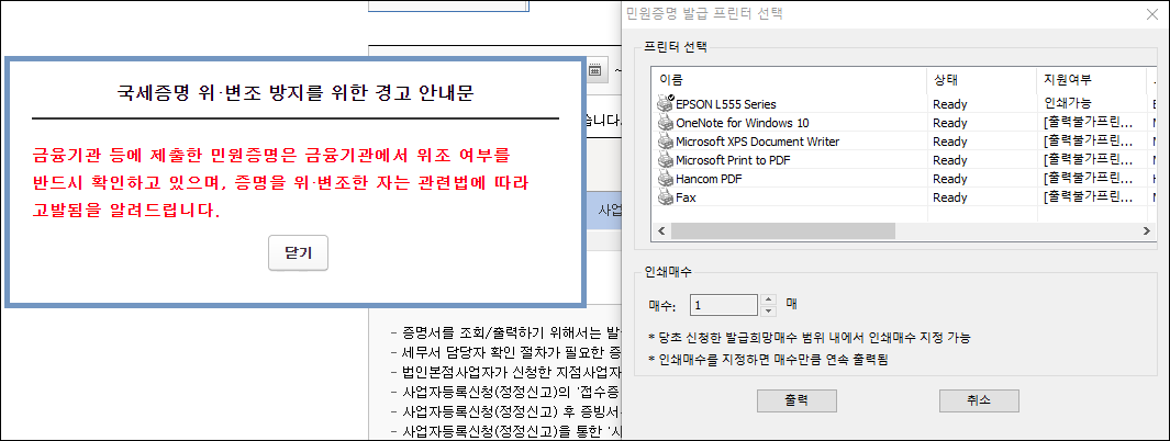 이제 사업자등록증 출력을 해야 합니다. 오른쪽 하단에 발급번호를 클릭하면 바로 사업자등록증을 출력할 수 있습니다. 간혹 사업자등록증 출력이 안 되는 경우가 있는데 프린트 설정이나 USB 케이블이 잘 꽂혀있는지 확인을 해보세요.