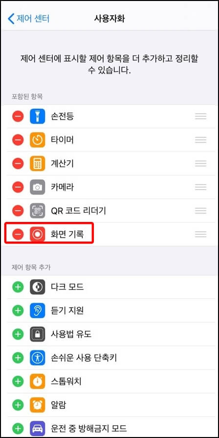 제어 항목 사용자화로 들어오면 화면 기록이라는 항목이 보입니다. 화면 기록이 바로 아이폰 화면 녹화 기능을 사용할 수 있는 항목이에요. 오른쪽 사진처럼 화면 기록이 포함된 항목에 들어가면 녹화 기능을 사용할 준비가 완료됐습니다.