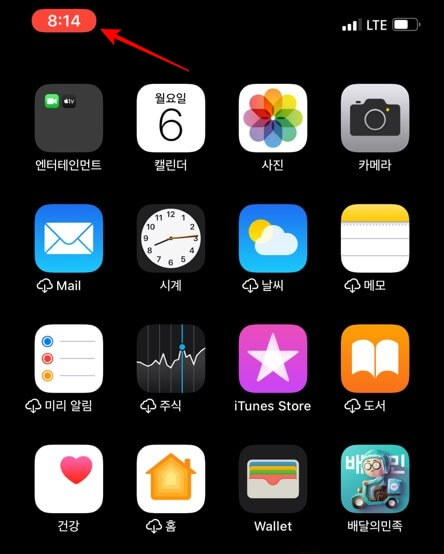 아이폰 바탕화면을 확인하면 화면 녹화가 진행되고 있는 아이콘을 볼 수 있습니다. 좌측 상단에 빨간 아이콘이에요. 아이폰 화면 녹화를 끄고 싶다면 저 아이콘을 클릭해서 화면 기록을 중단할 수 있습니다. 녹화된 동영상은 자동으로 갤러리에 저장되어서 확인을 할 수 있습니다.