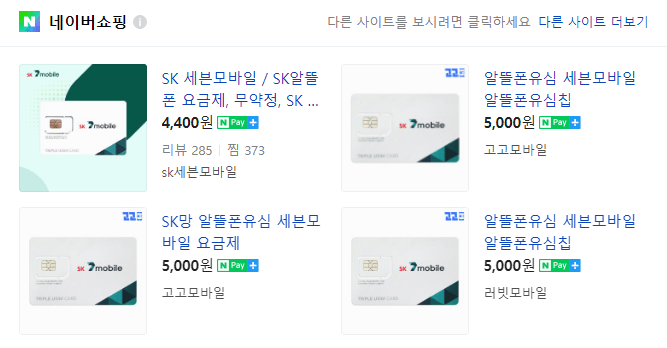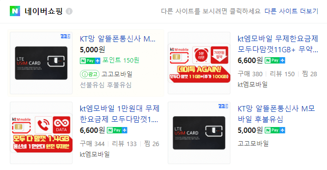 알뜰폰 유심을 반값에 구매하고 싶다면 네이버 쇼핑을 이용하는 것입니다. 네이버 쇼핑에서는 택배비 무료에 유심을 4,400원에 판매를 하고 있어요. KT 엠 모바일은 6600원.