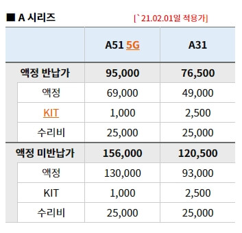 2월 1일 기준 삼성서비스센터 갤럭시A시리즈 액정수리 요금을 가져왔습니다.