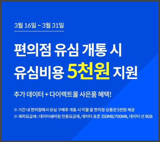 현재는 편의점에서 엠모바일 유심을 구매하면 5천원을 상품권은로 지원을 한다는 내용이 있습니다. 편의점을 자주 이용하신다면 상품권을 지원받는것도 괜찮다고 생각합니다.