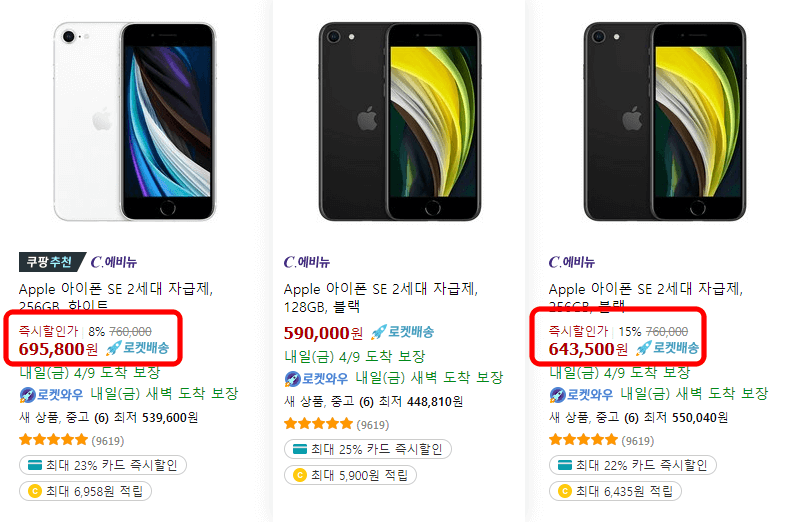 쿠팡 자체적 할인이 1%, 3%가 너무 적다고 느껴질 수 있겠는데요, 제가 예전에 아이폰xr등을 알아볼때는 20%이하는 구매할 생각도 하지 않았던 기억이 납니다. 아이폰se2의 경우 쿠팡 즉시할인이 8%, 15%가 적용이 되는데 아이폰 기종에 따라서도 할인율이 다르게 적용됩니다.