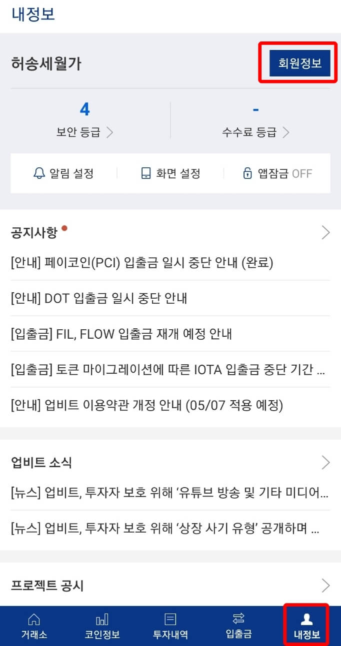 저는 업비트 앱에서 신청을 했습니다. [내 정보 → 회원정보]로 진입을 합니다.