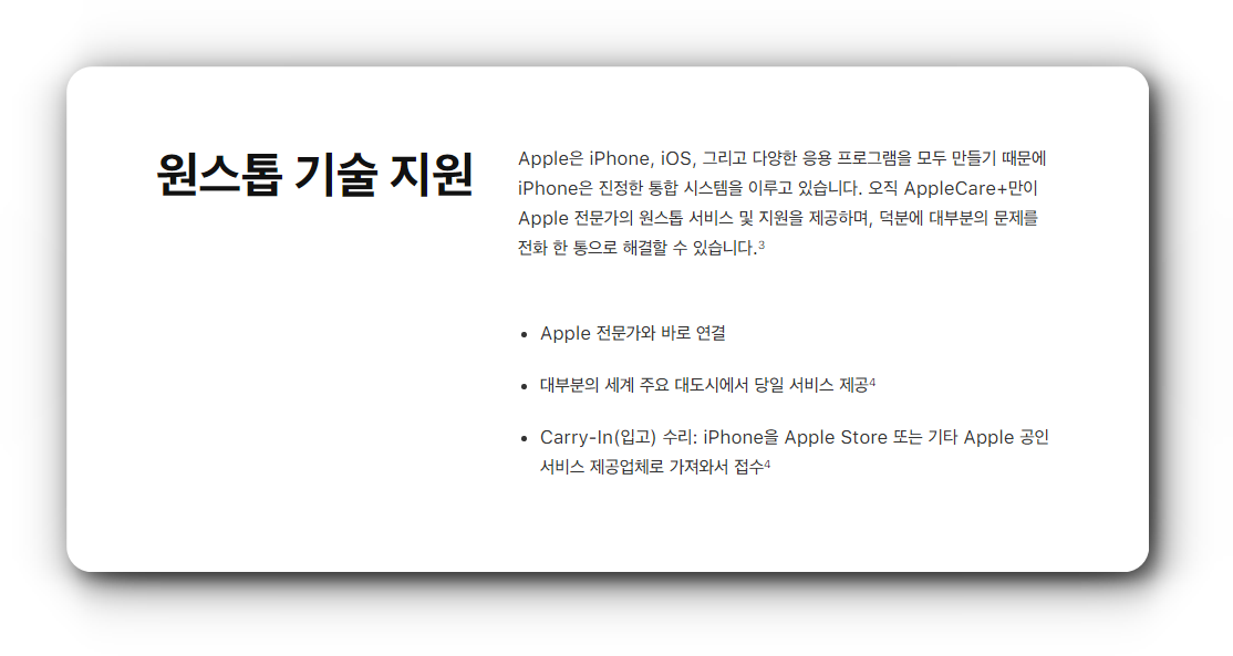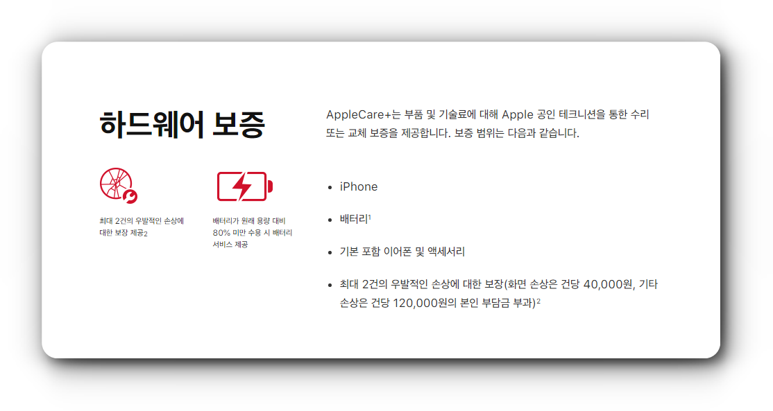 애플 홈페이지에서 가져온 이미지입니다. 음 아이폰을 가장 잘 아는 전문가여도 이런저런 사유로 수리가 안된다는 철벽을 치는 애플이기 때문에 애플케어플러스가 좋은 이유였죠. 애플케어플러스가 가입되어 있다면 묻지 마 리퍼폰으로 교환해주는 정책이었기 때문에 아는 분들은 애플케어플러스를 미리미리 가입해뒀었습니다.