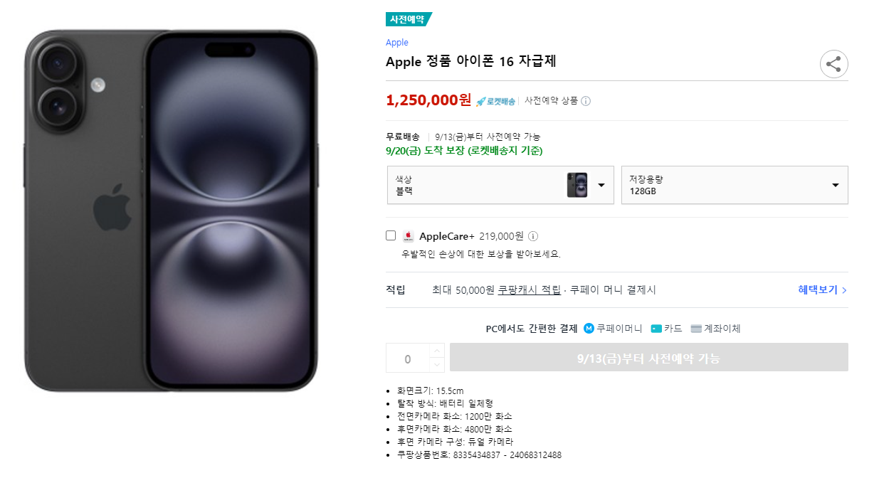 쿠팡 홈페이지에 접속하시면 아이폰16의 가격과 다양한 정보를 확인할 수 있습니다. 아직 카드 할인은 공개되지 않았지만, 사전예약 오픈과 동시에 나타날 예정입니다.