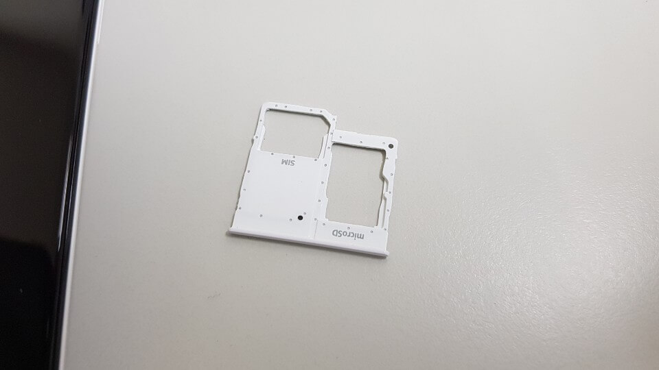 좌측 측면에는 빅스비를 지원하지 않기 때문에 빅스비 버튼이 없습니다. 왼쪽 상단에는 유심을 끼우는 부분이 보입니다. 갤럭시 진2의 저장용량은 32GB의 용량으로 추가로 SD카드를 탑재하여 512기가 바이트까지 지원을 합니다.