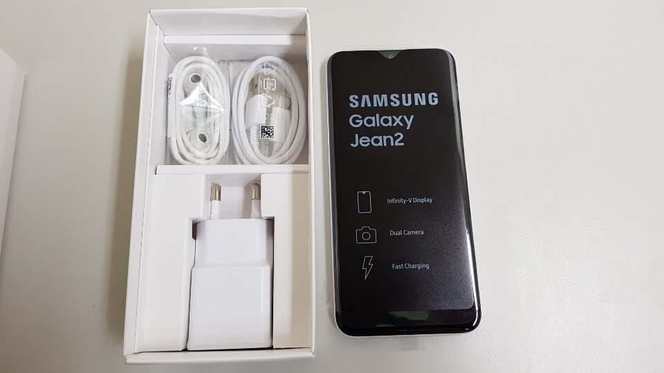 갤럭시 진2의 기본적인 구성품은 이어폰, 충전기와 사용설명서가 들어있습니다. 오른쪽의 갤럭시 진2를 보면 기본적으로 진2가 강조하고 있는 기능들이 보입니다.