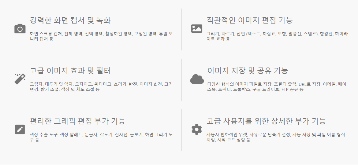 - 위젯: 상시 실행되며 간단한 캡처와 드로잉 기능 제공