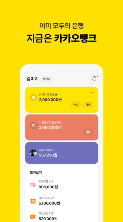 은행업무를 카카오뱅크 앱 하나로 예금, 적금, 대출, 해외송금, 체크카드, 모임통장, 내 신용정보까지