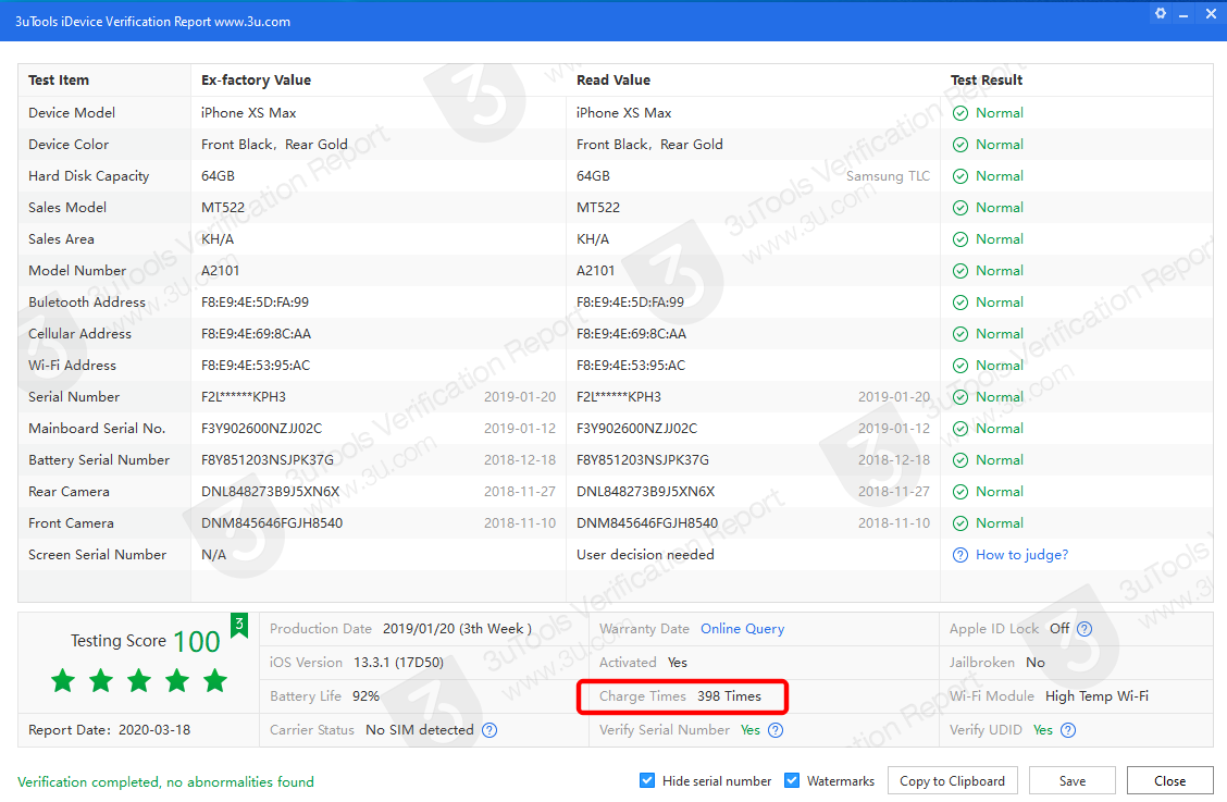 빨간 네모박스를 보면 Charge Times 부분이 보이게 됩니다 398 Times로 총 아이폰 배터리 완충을 398번 완료했다는 것입니다. 바로 밑에 배터리 성능 상태도 바로 나오게 되는데요 92%로 아직 준수한 수준 입니다. XSmax라 6개월에서 1년 정도는 더 사용이 가능해 보이네요.