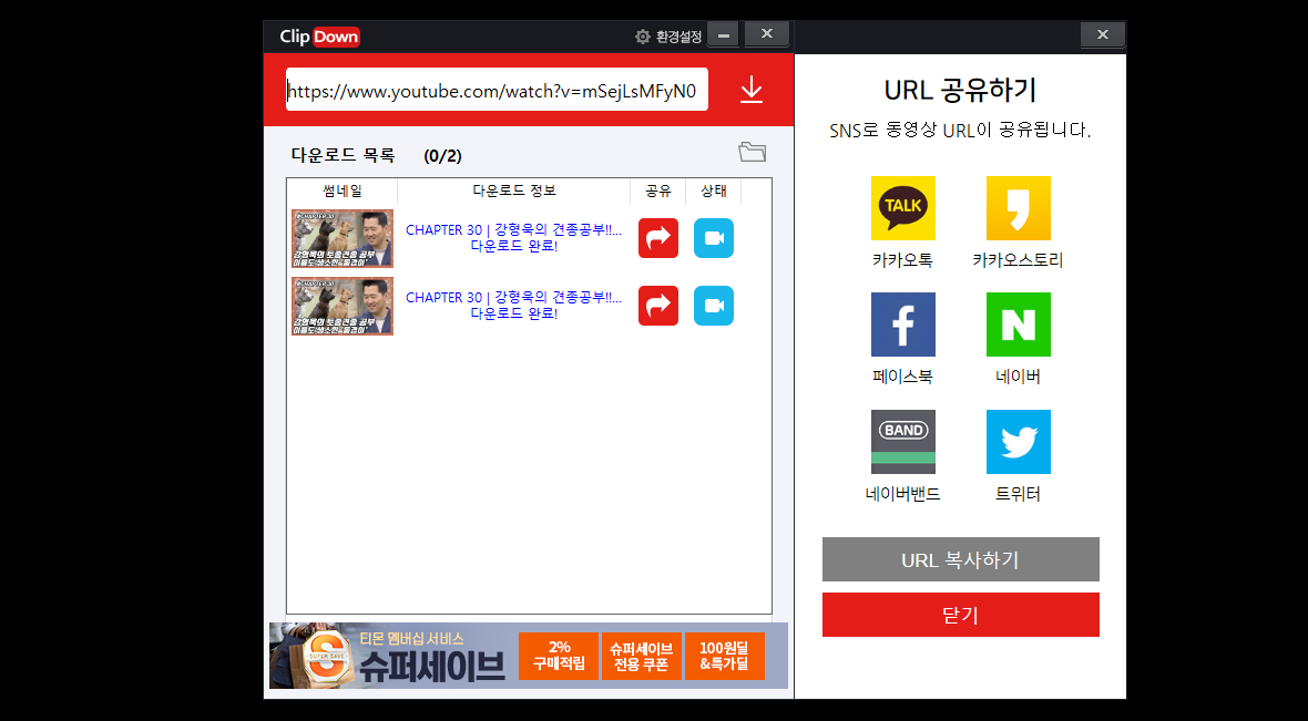 클립다운(Clip down) 사용법은 유튜브 채널 영상의 주소를 복사하여 프로그램 상단에 붙여넣기를 해줍니다. 잠시 영상을 분석한다는 창이 뜬 후에 화면 오른쪽에 오디오 또는 비디오 중 어떤 것을 다운로드할지 선택하라는 창이 뜨게 됩니다.