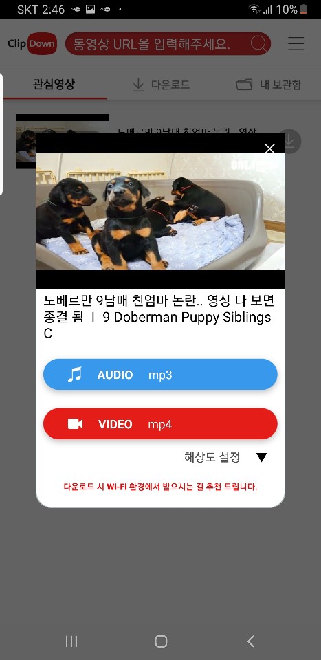 위 링크 복사를 클릭하고 클립다운 어플로 돌아오면 자동으로 오디오 또는 비디오 영상 다운로드를 할 것인지 선택하는 창이 뜨게 됩니다. 여기서 해상도 설정을 해주고 원하는 방식의 파일을 다운로드하면 끝이 납니다.