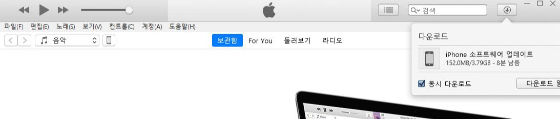 아마 아이튠즈 화면에서는 아무런 변화가 없을 것입니다. 하지만 오른쪽 위에 화살표 보시를 보면 소프트웨어가 다운로드 중인걸 확인할 수 있습니다. 소프트웨어 다운로드가 끝나고 초기화가 진행되기 때문에 10분~20분 정도 기다려 주면 아이폰7 공장초기화가 완료됩니다.